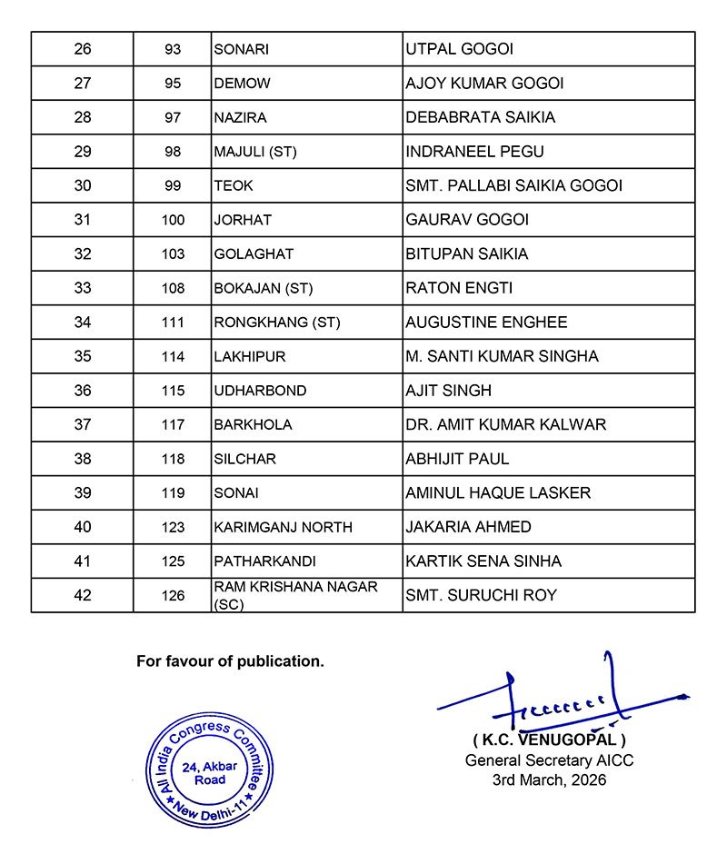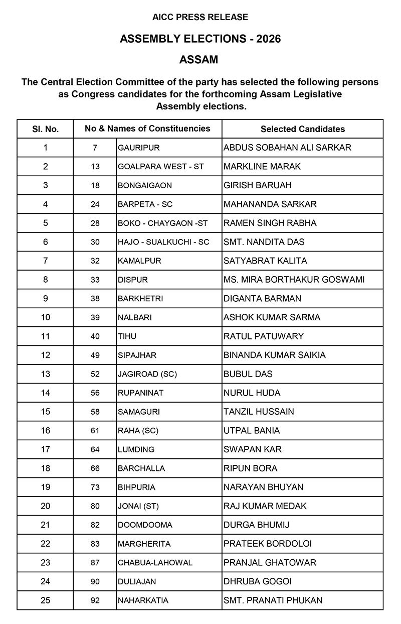 The Congress leadership remains hopeful that the newly announced candidates will strengthen the party’s presence and help build momentum toward what it describes as a “stronger and more prosperous Assam.”