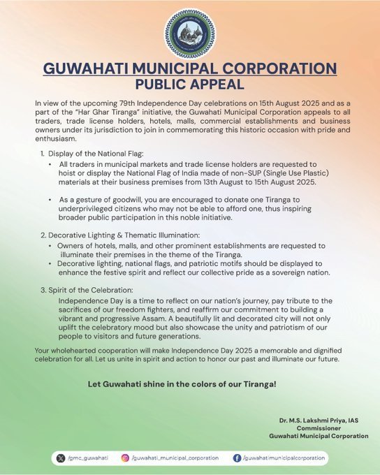 Commissioner Dr. M.S. Lakshmi Priya, IAS, stated that Independence Day is a moment to honour the sacrifices of freedom fighters, reaffirm unity, and commit to building a progressive Assam. “Let Guwahati shine in the colours of our Tiranga,” she said, urging wholehearted participation to make the celebrations memorable and dignified.